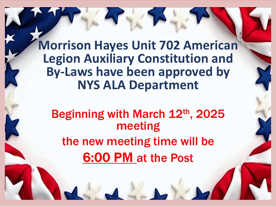 Morrison Hayes Unit 702 American Legion Auxiliary will be changing their monthly meeting times to 6:00 PM beginning March 12th, 2025.
