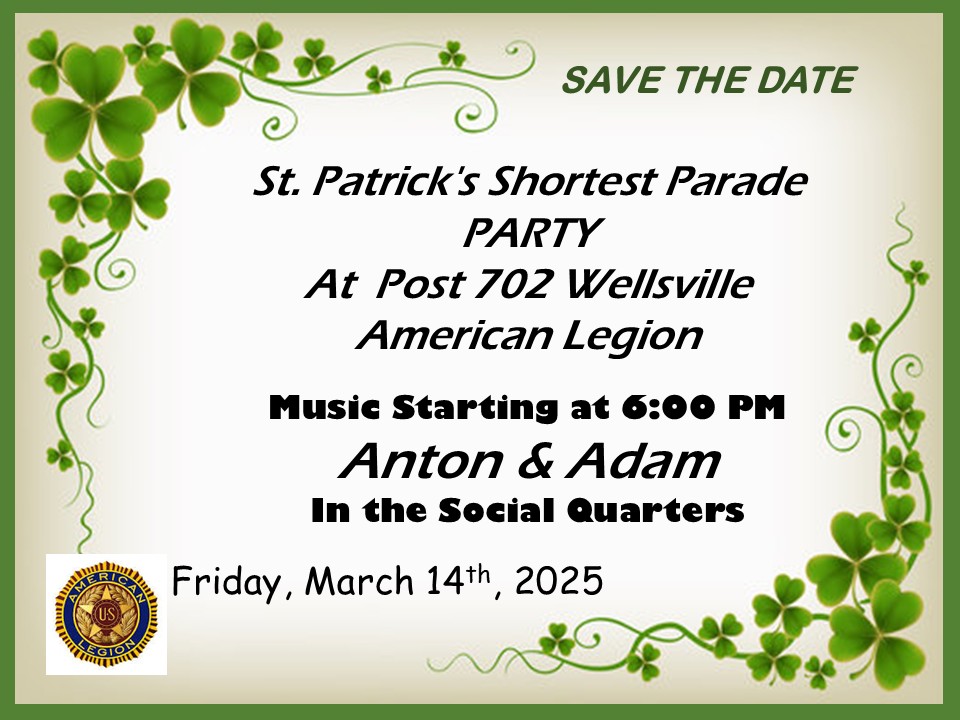 VERIY START TIME OF BAND — Join us for the grand opening of our new addition at Post 702.  St. Patrick’s Shortest Parade PARTY At  Post 702 Wellsville  American Legion Music Starting at 6:00 PM Anton & Adam In the Social Quarters Friday, March 14th, 2025