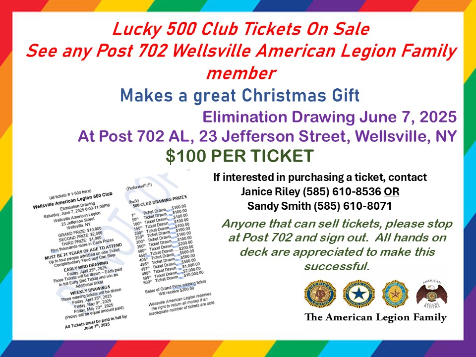 There are tickets left for the Lucky 500 Club– see any Post 702 American Legion Family Member to puechase or call 585-593-5345 for information.