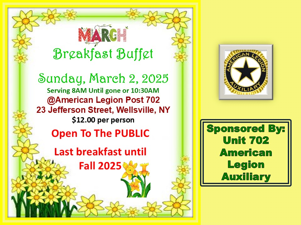 March 2nd, 2025 Stop by Morrison Hayes Post 702 for a hot buffet breakfast.  Last one till October 2025.