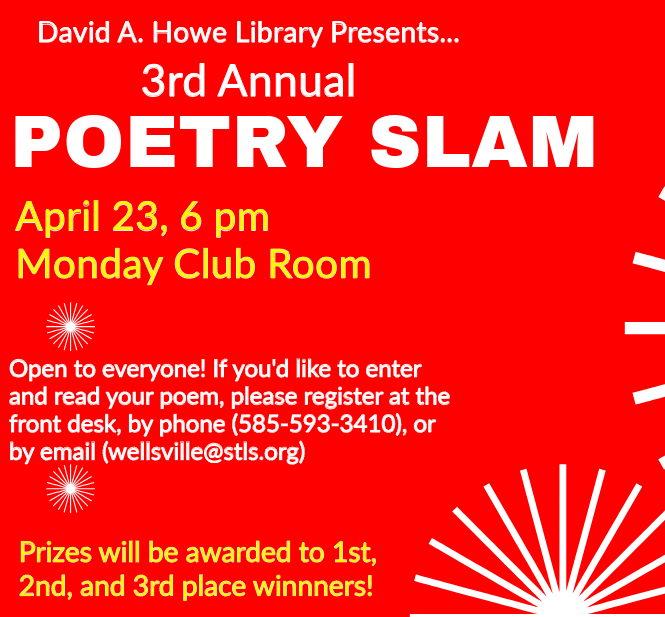 The Annual Poetry Slam will take place April 23rd at 6pm in the library’s Monday Club Room. It is free and open to everyone. Registration is required for those who would like to read one of their poems. To resister, stop by the front desk, call (585) 593-3410, or email (wellsville@stls.org)