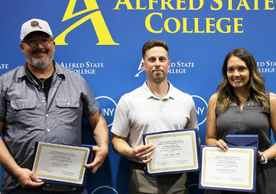 A trio of Alfred State faculty members were honored with the Excellence in Faculty Advising Award. Tony Aquilina (Assistant Professor Business), Stephen Cady (Instructor Building Trades), and Breanna Willson (Assistant Professor Nursing).