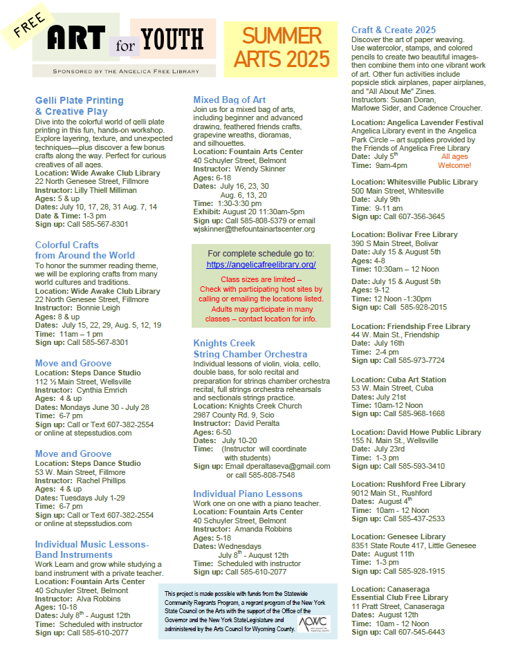 Opportunities all summer long in Allegany County for a wide range of art education provided by local libraries, art centers, and professional artists!!
