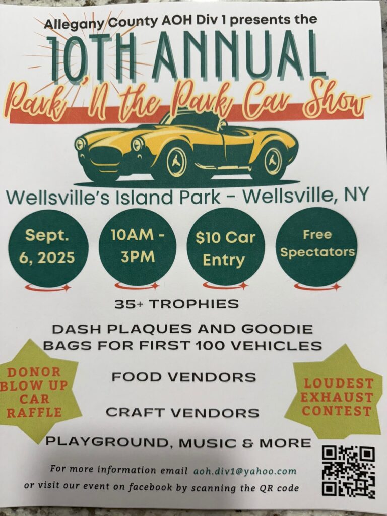 Get your classic trucks and cars ready as all roads in Allegany County again lead to Wellsville, NY for the 10th Annual Ancient Order of Hibernians’ Park in the Park Car Show on September 6th, 2025. This years 10th anniversary AOH Car Show is also expecting to see a boost in the number of car and truck entries as Mike Hennessey and Allegany County Veterans Administration along with A C Dwyer are paying the $10 entry fee for any all veterans that bring their rides to Island Park for the car show! In addition, A C Dwyer and the Local Veterans Administration will also buy the veterans and their families lunch at the car show! The Veterans Administration also is sponsoring a special Veterans Best in Show trophy! Veterans can pre-register their car show entries at # 585-268-9217 or visit www.alleganyco.gov/salute or drive in the day of the car show! The Allegany County AOH Division Division #1 applauds our local Veterans Administration and A C Dwyer’s efforts to support and recognize our local veterans and their families!