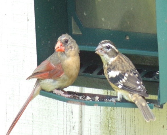 The birds, one each of a female Cardinal and Grosbeak, in the accompanying photo are not “Birds of a Feather,” but they certainly think they are.