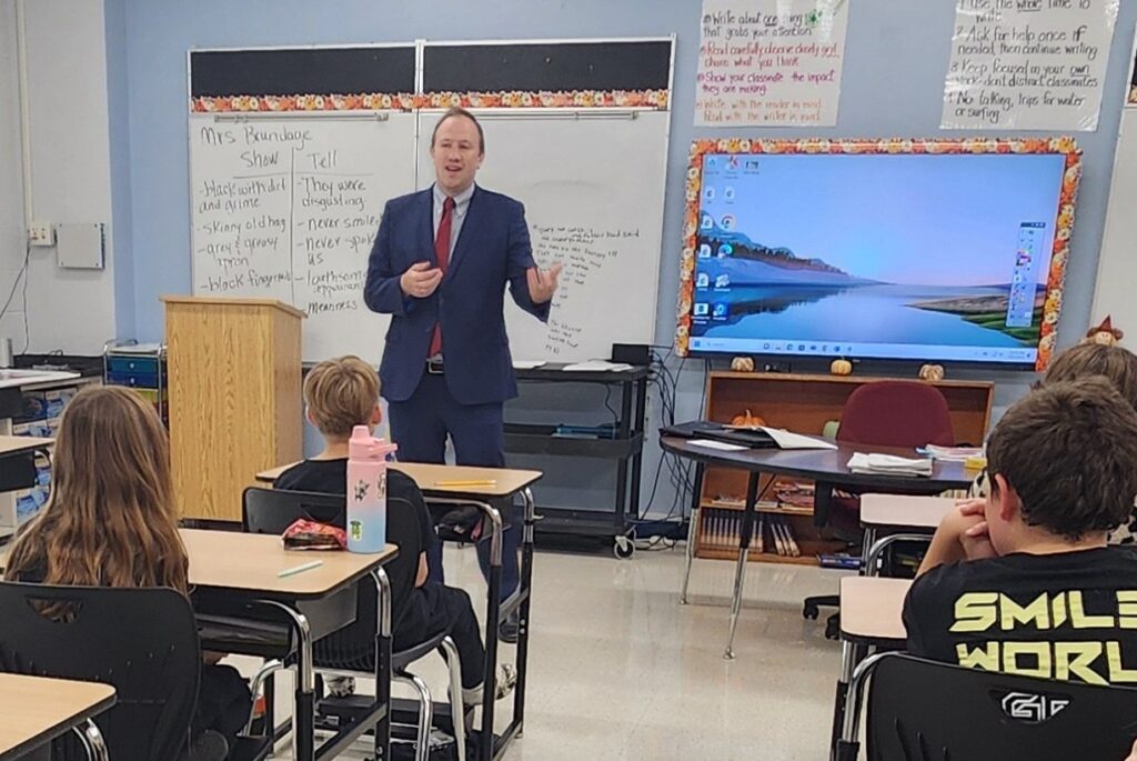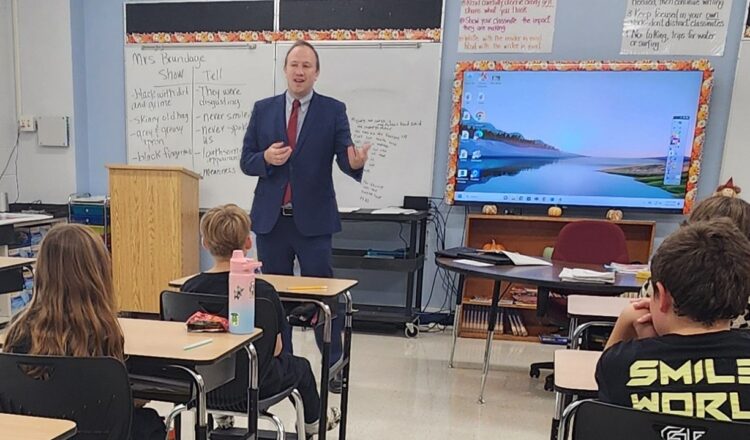 Assemblyman Joe Sempolinski talks with students in Ms. Amy Brundage’s sixth-grade class at Whitesville Central School