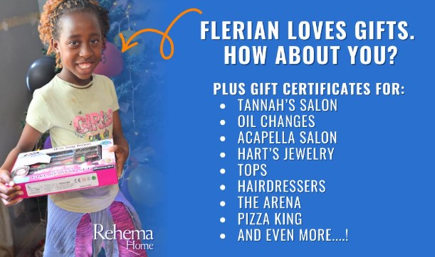 Flerian also is showing you some goodie baskets and a list of just some of our gift certificates, all while showing off a past Christmas gift. (For those who have eagle eyes, yes – that is a Christmas tree filled with balloons as ornaments! Christmas decorations are limited at Rehema Home – but love is not.). So swing on by, because every penny you donate toward this basket raffle will feed Flerian and her siblings. See you TOMORROW!
