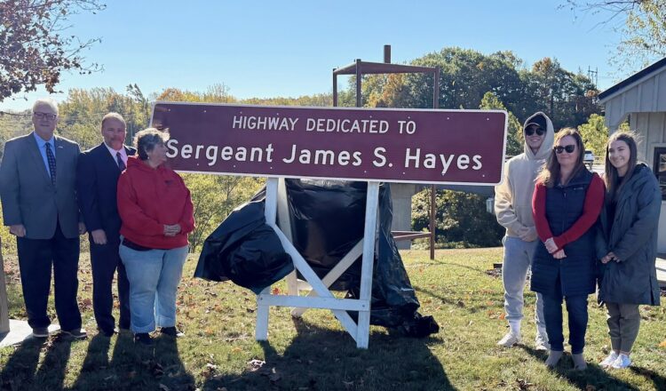O’Mara, Palmesano, and Gibbs joined Hayes’ wife, Amanda, their children Damian and Rebecca, his mother, Rose, brother, Robert, other family members and friends, fellow veterans, and area officials at today’s tribute, which included the unveiling of the state Department of Transportation signage ceremony designating the “Sergeant James S. Hayes Memorial Highway.”