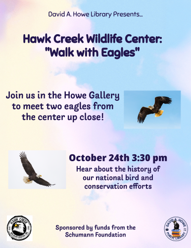 Join us in the David A. Howe Gallery for the rare opportunity to have an up-close encounter with our national symbol, the bald eagle, and one of our other eagle ambassadors. Hawk Creek Wildlife Center will give a 45 minute presentation exploring the natural history of the bald eagle and how their recovery can now be used to help other eagle species globally. This is your chance to look an eagle in the eye and know North America’s most powerful avian predators.