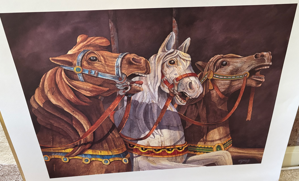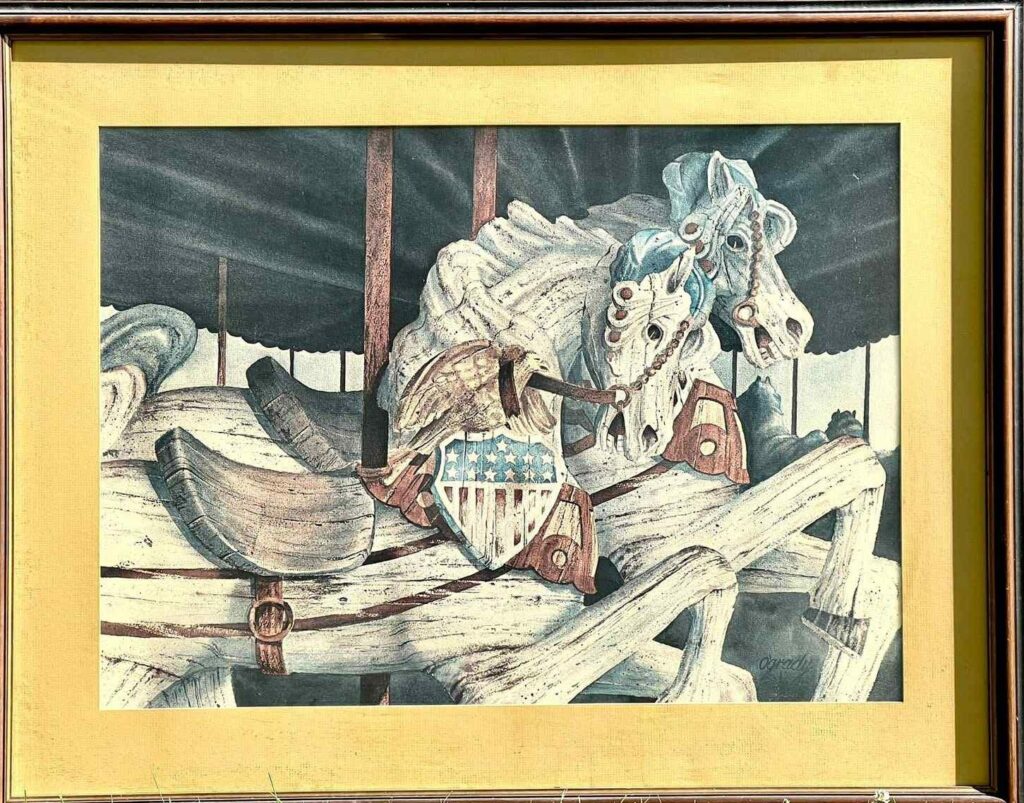 Eventually this carousel came to rest at the small amusement park on Cuba Lake. Tom O’Grady (the local artist who created many of the Wellsville Balloon Rally posters) lived in Cuba, worked summers at a marina on Cuba Lake, and did a painting of the carousel horses titled “Yankee Doodle.” The original of this painting was displayed in the NYS Governor’s Mansion for years. Professional prints of the painting have been “sold out” for years.