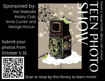 The Teen Photography Show is once again sponsored by the Wellsville Rotary Club, with a special donation from Anne Currier and George Hrycun. Last year there were over 100 entries in the show, and the library hopes to recognize many talented young photographers again this year.