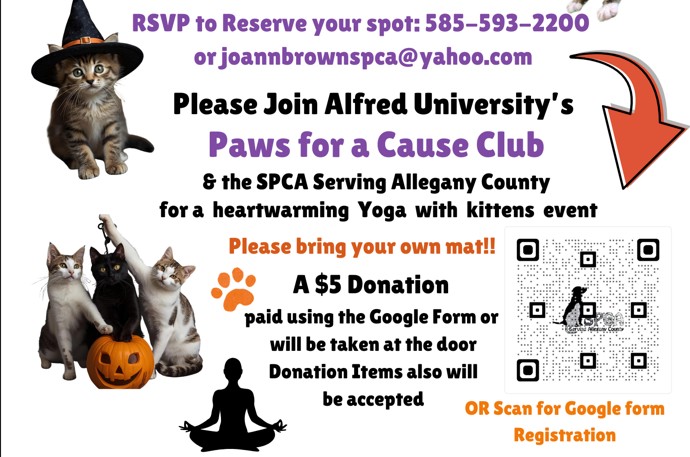 Come join the SPCA and Alfred University’s Paws for a Cause Club for this heartwarming yoga event where every stretch supports a good cause — and every purr brings a little more peace.