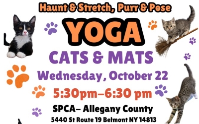 The SPCA Serving Allegany County, in collaboration with Alfred University’s Paws for a Cause Club, invites the community to a purrfectly relaxing and heartwarming evening of Cats & Mats Yoga on Wednesday, October 22, from 5:30 p.m. to 6:30 p.m.