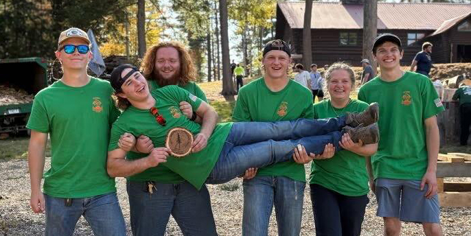 The Alfred State logging sports team shows off their trophy for their solid performance at the Paul Smith’s Fall Meet