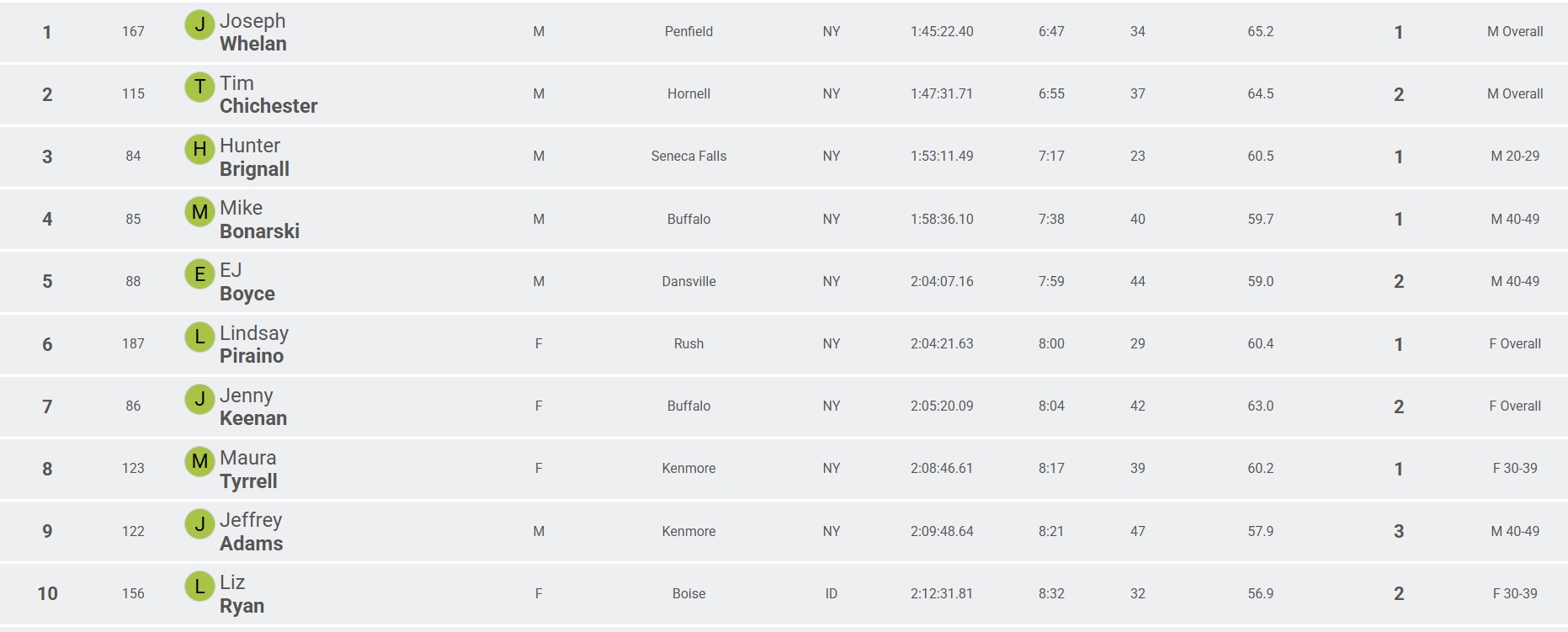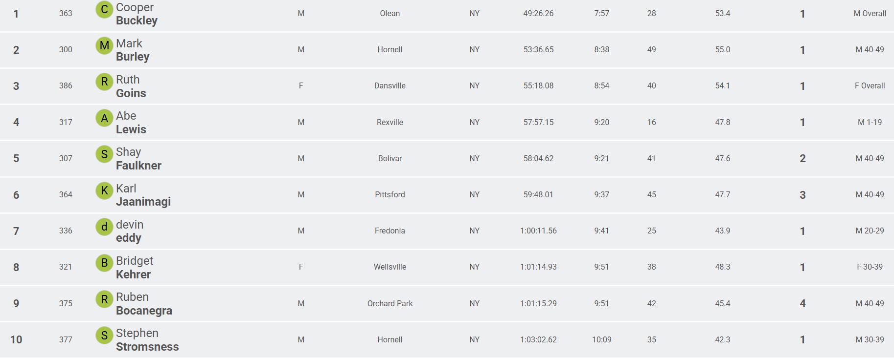 Cooper Buckley of Olean NY ran the 10K in just under fifty minutes to earn the top spot! Dansville’s Ruth Goins blazed the trails to take the #1 spot in the women’s run.
