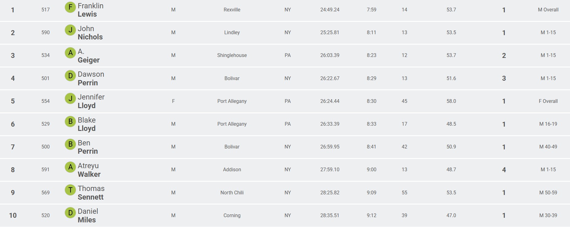 The 5k run was led by Franklin Lewis from just a few ridges over in Rexville NY and Jennifer Lloyd of Port Allegany was the first to finish in the women’s division.