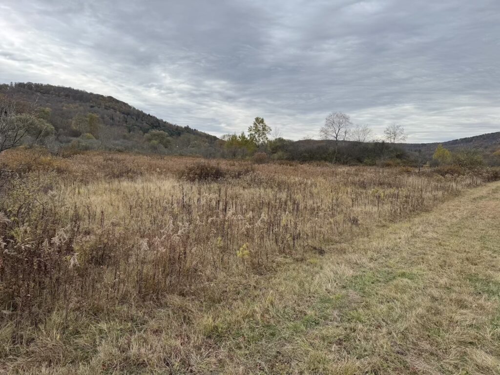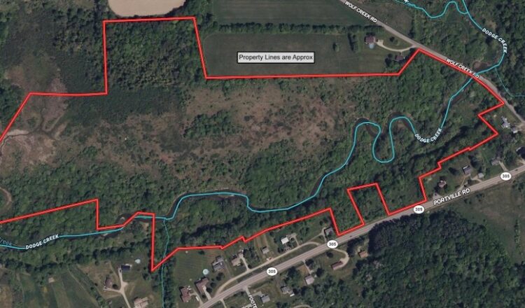 The land is mostly level and open with scattered shrubs and apple trees, and areas of hardwoods and pines. There are established trails throughout for easy access of the land. Dodge Creek runs from east to west through the property. This creek is stocked with Brown Trout, Rainbow Trout and Largemouth Bass. There are a couple of potential building sites on Obi Portville Road, also with frontage on Wolf Creek Road for multiple access points. The property could be used to build a home or a nice cabin, also the ability to use as farmland and pastureland as well. Whitetail deer and turkey signs throughout making this a great hunting property. Electric is located at the road. This property is in the Portville School District. All rights convey.