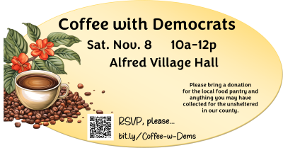 Belmont, NY – The Allegany County Democratic Committee (ACDC) will collect nonperishable food and personal care items for the Alfred University Food Pantry at its monthly “Coffee with Democrats” event.  The federal government’s unlawful withholding of SNAP funds has ramped up the urgency to help those less fortunate.