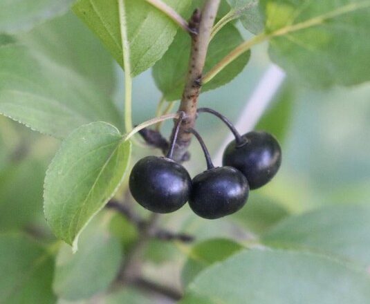 The fruits of common buckthorn are not kind to man or mammals as they possess a chemical called emodin which increases water content in the colon and leads to the runs.