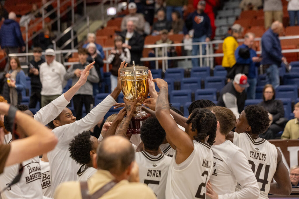 Photo: The St. Bonaventure men’s basketball team celebrates winning (and retaining) the Franciscan Cup. Photo by STEVE HARRISON/Sun, see Steve’s slideshow of photos after Chuck Pollock’s column)