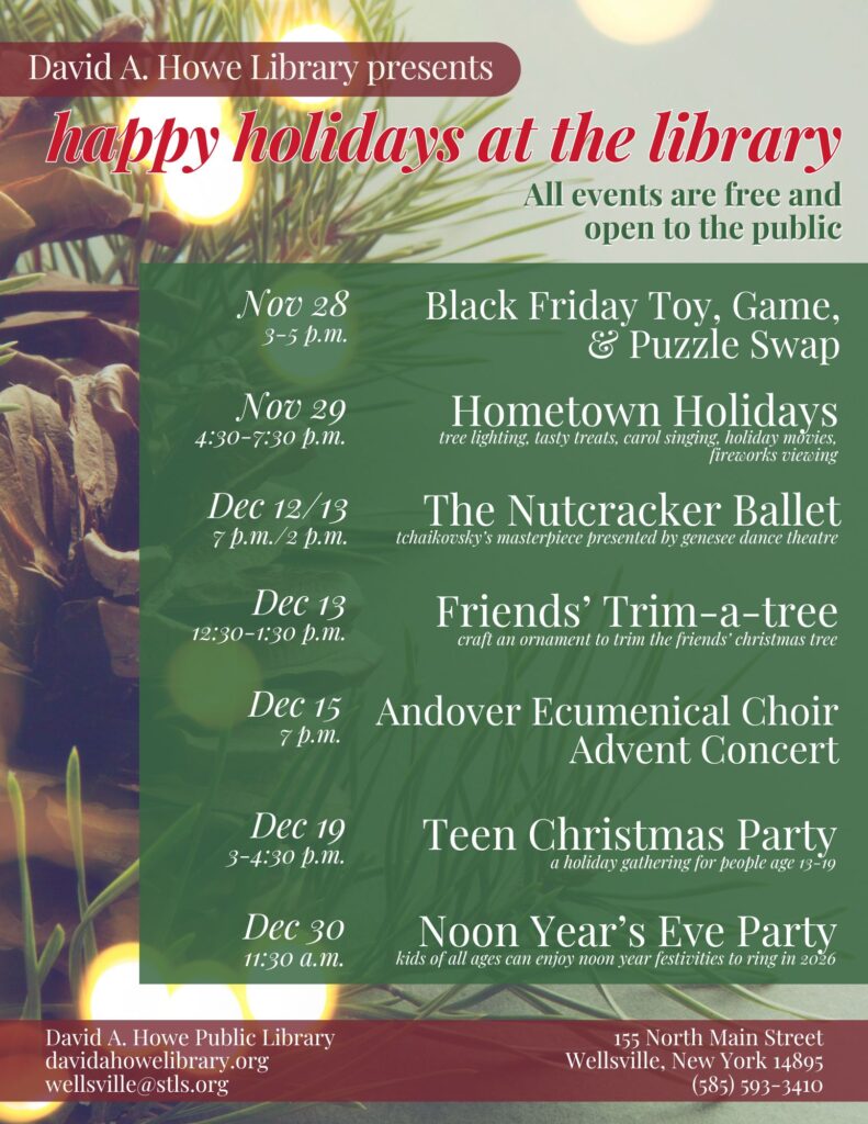 Continuing the festivities, Genesee Dance Theatre brings its 11th annual production of Tchaikovsky’s The Nutcracker to the Nancy Howe Auditorium for two spectacular performances, bringing together a cast of local dance students and even some Wellsville children as mice. They will perform on Friday, December 12, at 7 p.m., and Saturday, December 13, at 2 p.m. Experience the enchanting Tchaikovsky score brought to life by a company of student and professional dancers. It’s a holiday delight for the whole family! Families are invited to come in before the Saturday performance for the Friends of the Library’s Annual Trim-a-Tree event, which will be in the Howe Gallery from 12:30-1:30 p.m.
