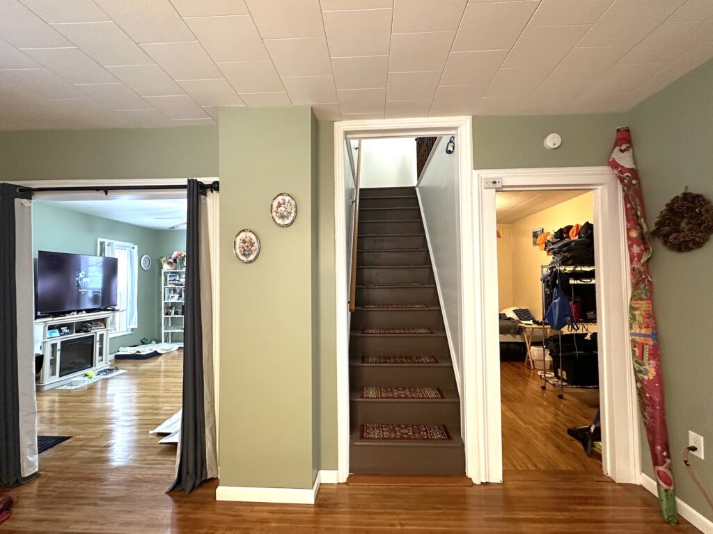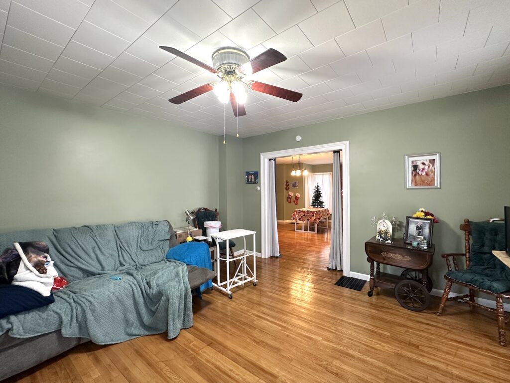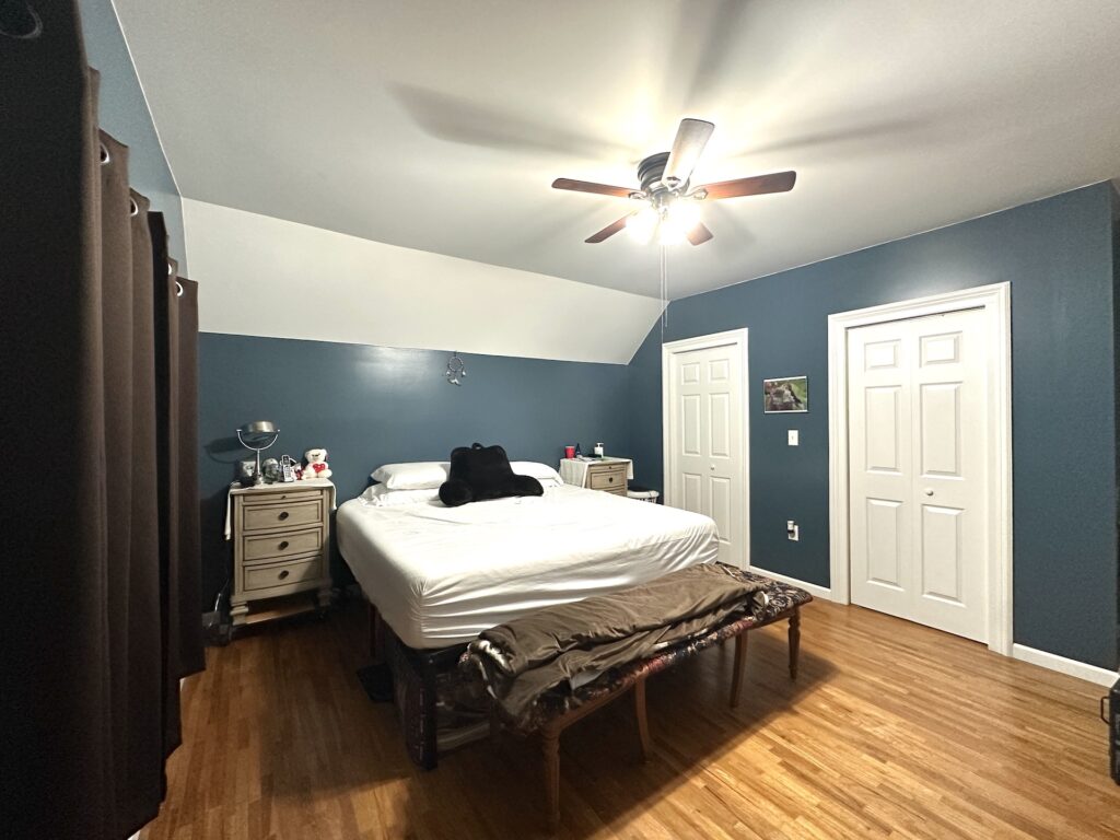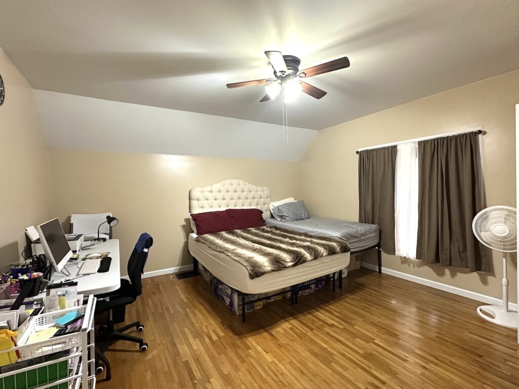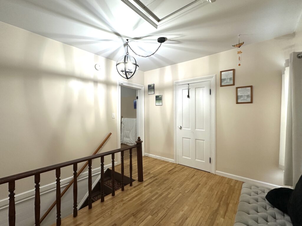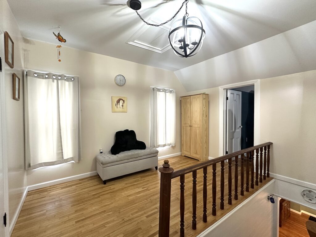 The upper level features two generously sized bedrooms with ample closet space, along with a spacious landing that can serve as a cozy reading nook, study corner, or flexible sitting area. Hardwood floors throughout the home add warmth and timeless character.