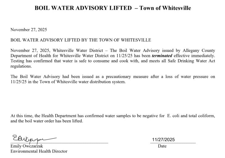 A mechanical failure at the Whitesville Water Treatment Facility lead to a boil water advisory earlier this week. Repairs have been made to they system and water samples have been tested by the Allegany County Department of Health. The water system is back in operation and the water is safe.