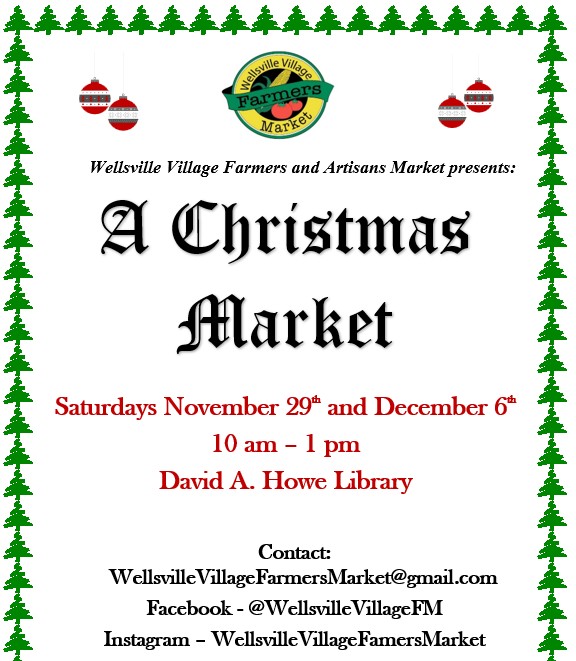 The Wellsville Village Farmers and Artisans Market will hold a Christmas Market on November 29th and December 6th from 10 am to 1 pm inside the David A. Howe Library.