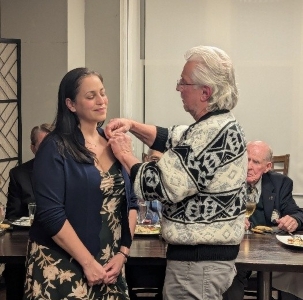 From the Wellsville Lions Club Charities, pictured is President Mike Raptis pinning new member Miriam Chalom