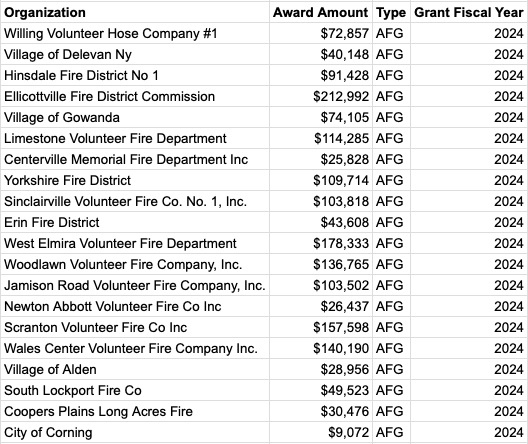 “Firefighters are heroes, and I am deeply proud to have secured more than $1.7 million in federal funding to invest in the technology and safety equipment that keeps our communities safe,” said Congressman Nick Langworthy. “These funds support critical upgrades such as new radios, turnout gear, air packs, and other lifesaving equipment for our first responders. I have visited fire departments throughout Western New York and the Southern Tier, and I have seen firsthand the meaningful impact these grants have—strengthening public safety while easing the tax burden on our rural communities.”
