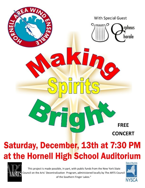 Your Hornell Area Wind Ensemble is performing another fabulous Christmas Holiday concert at the Hornell High School Auditorium on Saturday, December 13 at 7:30 PM. Co-directed by Mr. Ed Belin and Mr. Chris Lynn, many of your holiday favorite tunes will be performed. Coventry Carol, A Christmas Festival, White Christmas, and of course everyone’s favorite, Sleigh Ride will be a part of the repertoire!