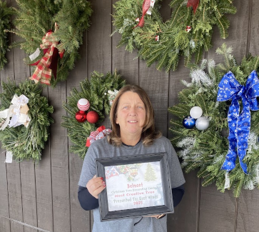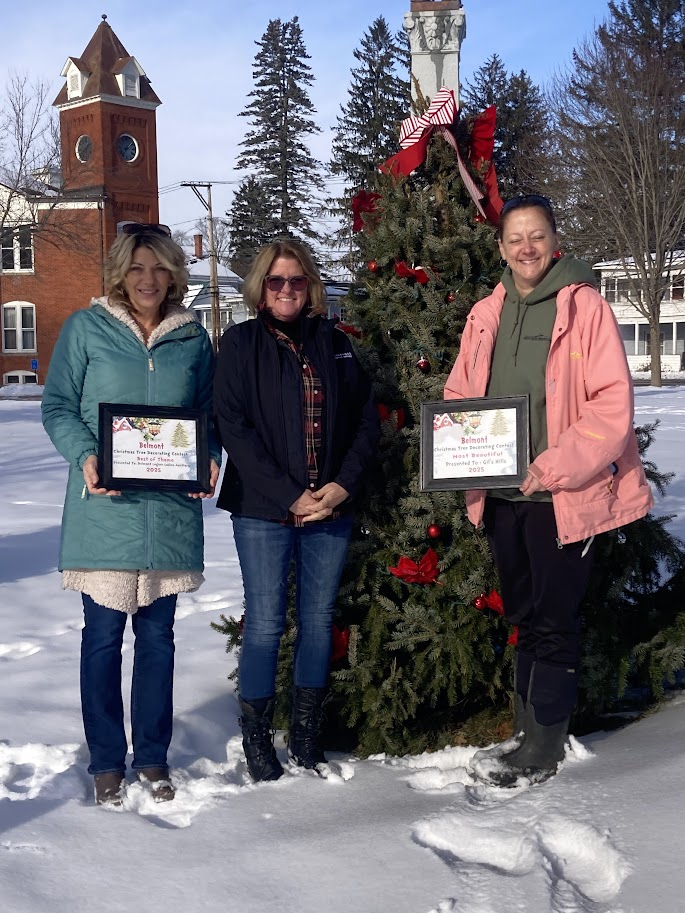 Although judges Netti White and Gena Decker braved chilly temperatures and plenty of snow, they trudged on cheerfully in Belmont’s Park Circle admiring the decorative efforts put forth by those who sponsored trees this year. Winners this year are as follows: