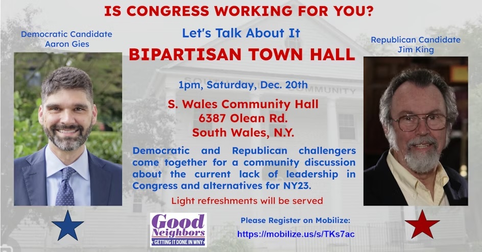 Belmont, NY – The Allegany County Democratic Committee would like to share an opportunity for voters to attend a bipartisan town hall with Republican and Democratic candidates for our district (23rd) of the US House of Representatives.