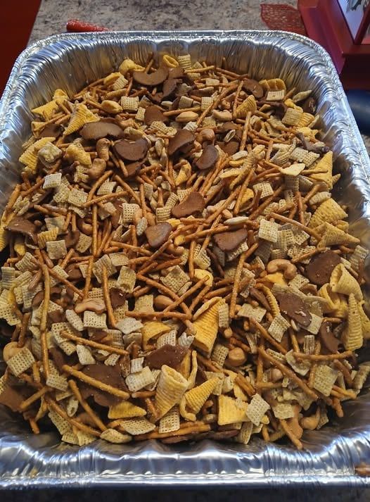 The picture that accompanies this Wrambling is a mix of cereal and snack items that we call Nuts-N-Bolts and which the cereal manufacturers call Chex Mix. There is often a copy of “their” recipe on the cereal box. We have added to, modified, eliminated the base recipe many times to get to what we now use. The most important modification that we made involves the liquid used to season the mix. The original recipe calls for the use of melted butter. Melted butter does not stay melted, so we now use our own “seasoned” cooking (vegetable) oil with some of the ingredients added to it before “drizzling” the oil onto the mix while continuously stirring and mixing. Note: Stir gently, more like a “fold,” to avoid the breaking up of the larger ingredients.