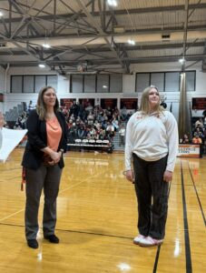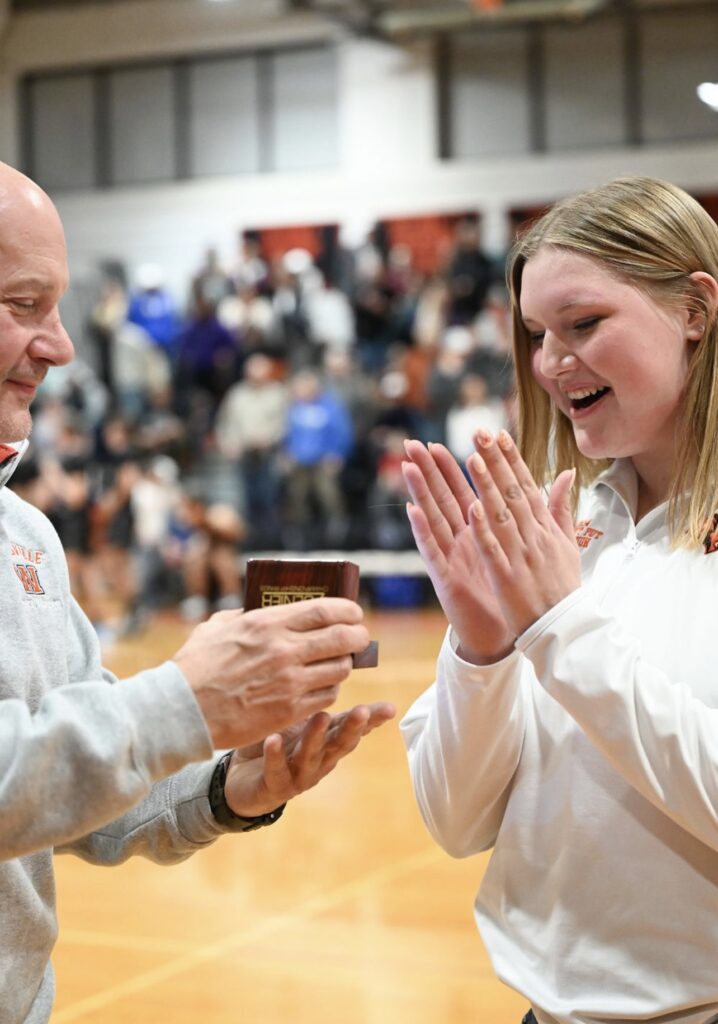 On Friday night during halftime of the Wellsville basketball game, Oswald was honored for three state championships during a ring ceremony.Kaylee was the NYSPHSAA State Champion in the shot put in 2023, 2024 and 2025 and is the only Wellsville athlete to ever win more than one state championship.
