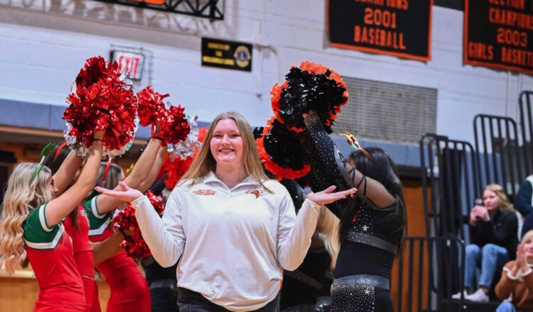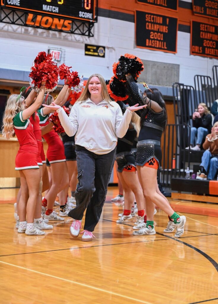 (In the photo, Kaylee was introduced and came out through a tunnel by the Wellsville cheerleaders. The three-time state champion received a beautiful ring from her coach, Larry Peacock and Wellsville Athletic Director Dawn Phillips. Ella Green photo)