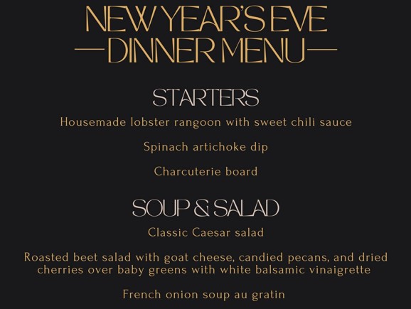 The evening begins with irresistible starters, including housemade lobster rangoon paired with sweet chili sauce, a rich spinach artichoke dip, and a beautifully arranged charcuterie board perfect for sharing. From there, guests can savor comforting classics and elevated favorites in the soup and salad course—think a timeless Caesar, a roasted beet salad with goat cheese, candied pecans, and dried cherries over baby greens, or a deeply satisfying French onion soup au gratin.