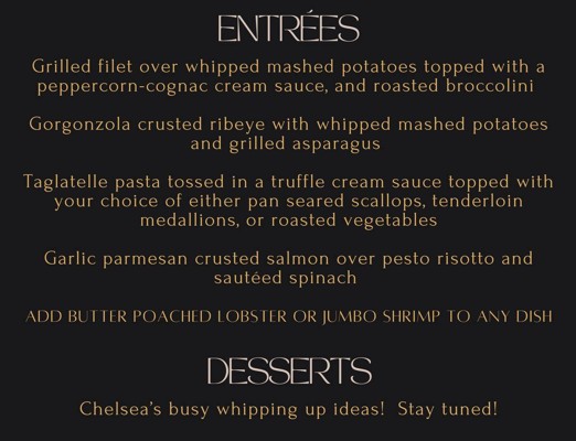 Whether a date night or going out with family and friends, our team has curated a delicious special limited dinner menu! Not looking for dinner, but just drinks and appetizers? We will also have a special limited bar menu. The kids menu will also be available for our younger diners.