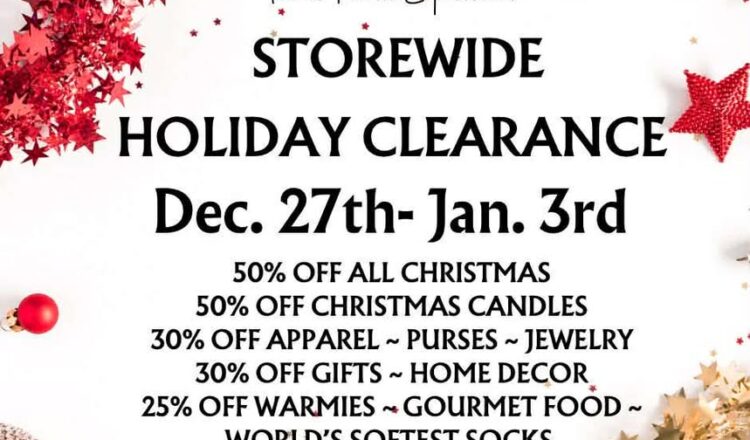 The post-Christmas sale features deep discounts across the store, including 50% off all Christmas merchandise and Christmas candles, making it an ideal opportunity for customers to stock up on décor and seasonal favorites. Shoppers will also find **30% off apparel, purses, jewelry, gifts, and home décor
