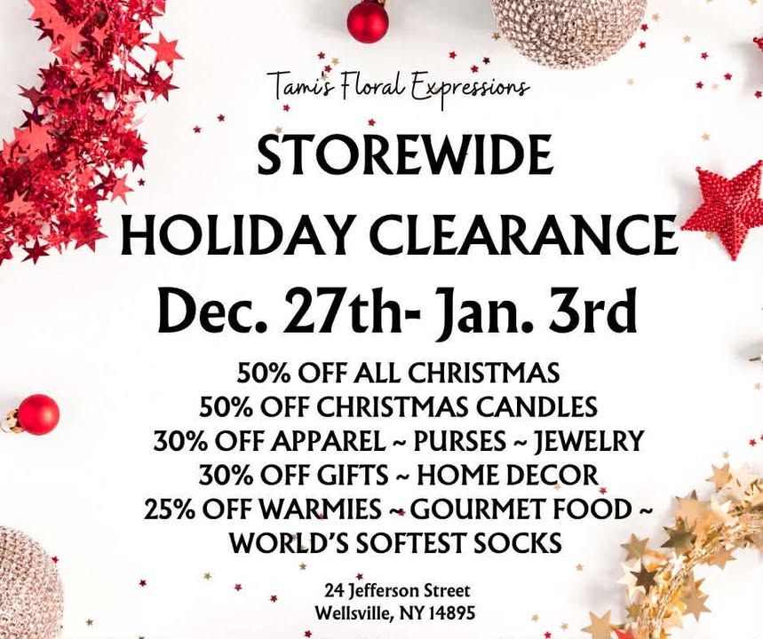 Tami’s Floral Expressions is inviting shoppers to celebrate the season with major savings during its Storewide Holiday Clearance, running December 27 through January 3 at its downtown Wellsville location.