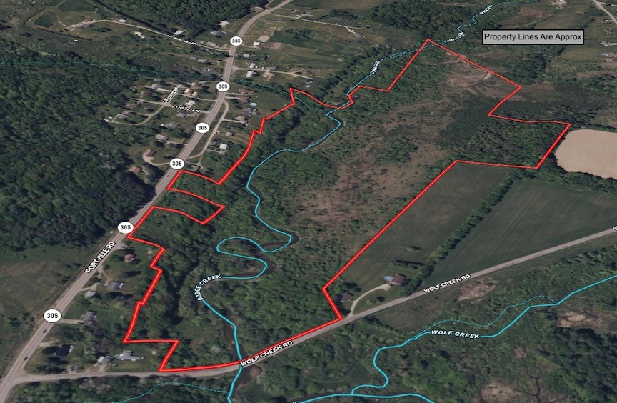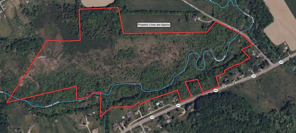 The land is mostly level and open with scattered shrubs and apple trees, and areas of hardwoods and pines. There are established trails throughout for easy access of the land. Dodge Creek runs from east to west through the property. This creek is stocked with Brown Trout, Rainbow Trout and Largemouth Bass. There are a couple of potential building sites on Obi Portville Road, also with frontage on Wolf Creek Road for multiple access points. The property could be used to build a home or a nice cabin, also the ability to use as farmland and pastureland as well. Whitetail deer and turkey signs throughout making this a great hunting property. Electric is located at the road. This property is in the Portville School District. All rights convey.