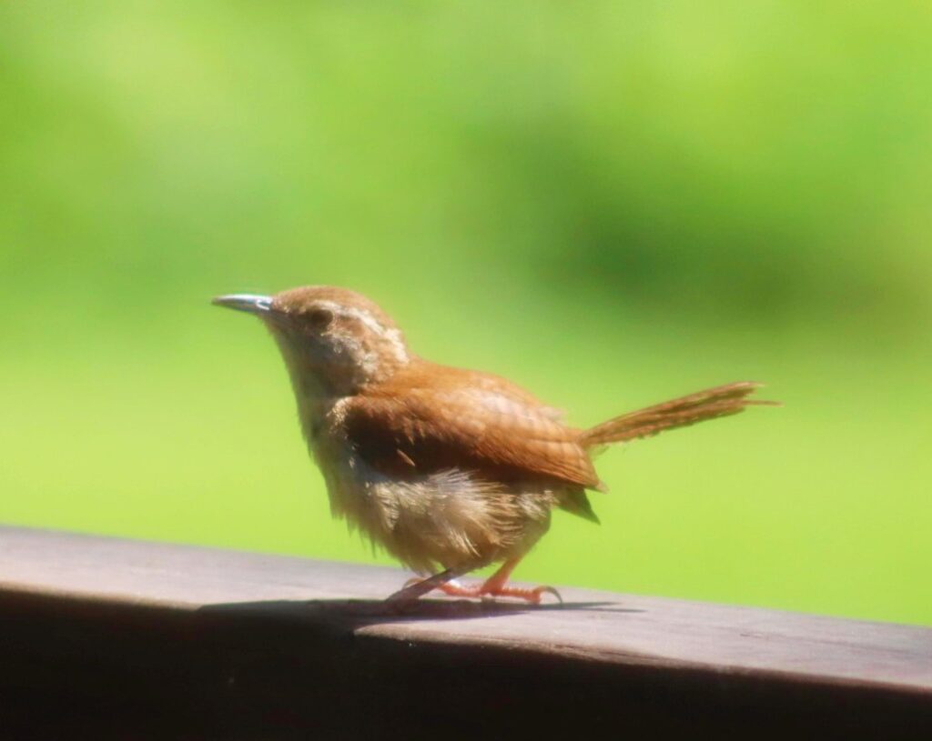It’s a lot of voice coming out of a small package. They may be the largest of the eastern wrens, but they are still quite diminutive, measuring, at most, five and a half inches from tip of the beak to end of the tail. They are told apart from the far more common house wren by their chunkier build and brighter coloration. Carolina wrens have a warm brown top, a chestnut-colored, even yellowish, underbelly, and a stark white eyebrow.