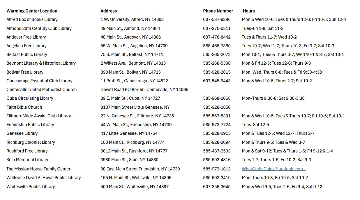 CODE BLUE: See Allegany County Warming Centers, in Steuben and Yates County Call 211
