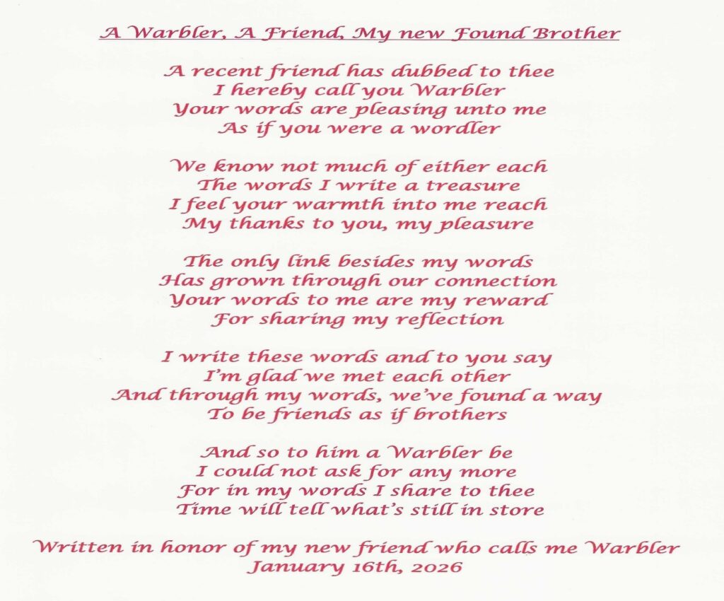 Another Grammar Groan for today is actually not a groan but an observation. The association between the word “plentiful” and the words “plenty full” is obvious. I absolutely love our language. And thus, I will share a poem generated because of recent conversations with a newly found friend who calls me the “Warbler.” I did not get his permission to use his name but may identify him later on. I will add, however, that he is older than I am so I will withhold using his name out of respect, as he is senior to me.