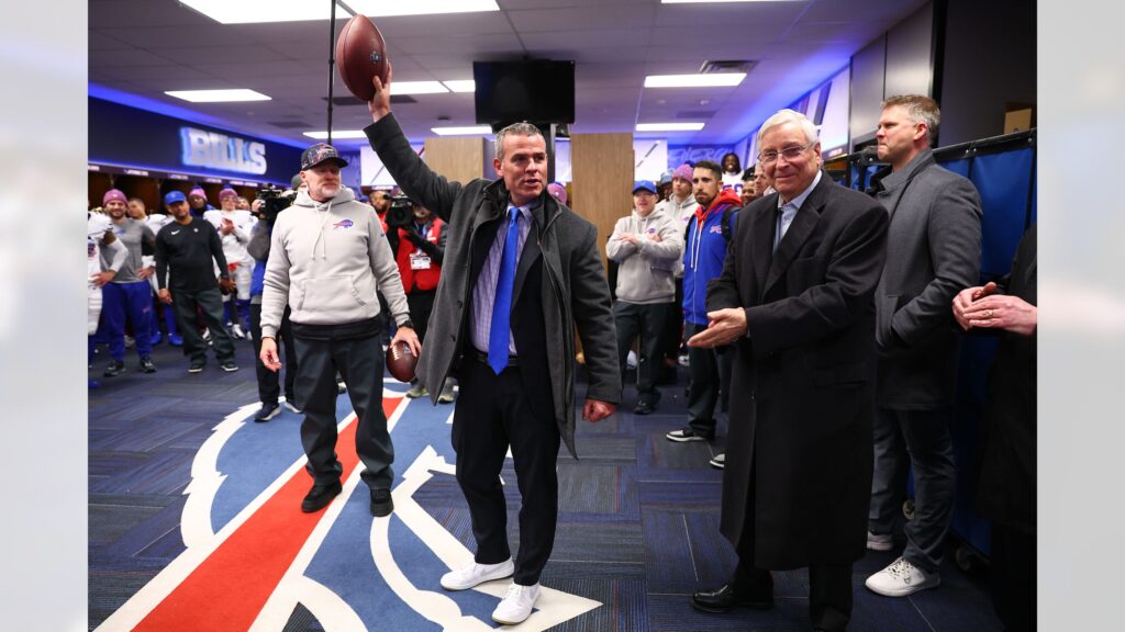 (Photo: From left, Sean McDermott, Brandon Beane (holding ball) and Bills owner Terry Pegula in happier times. Buffalo Bills file photo)