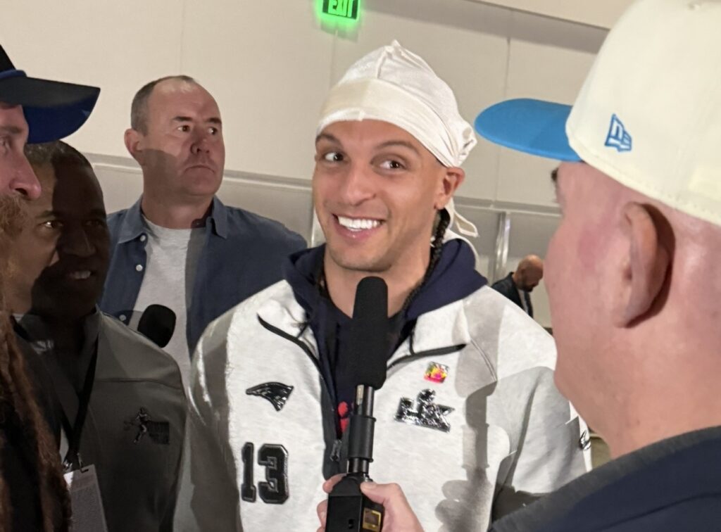 (Photo: Former Buffalo Bills wide receiver Mack Hollins (at media day in San Francisco) will run on the field at the Super Bowl for the Patriots, and you can bet on the chance a fan will do the same. John Anderson photo)