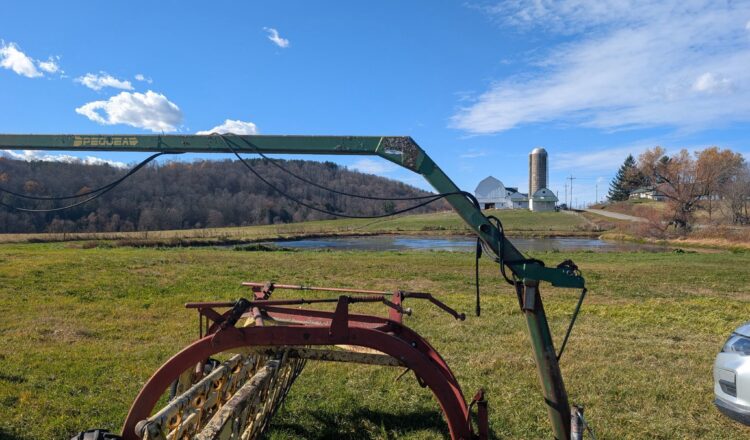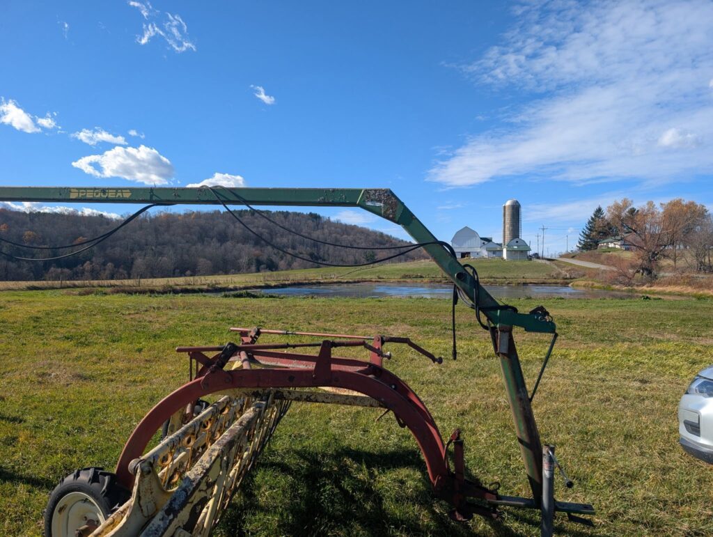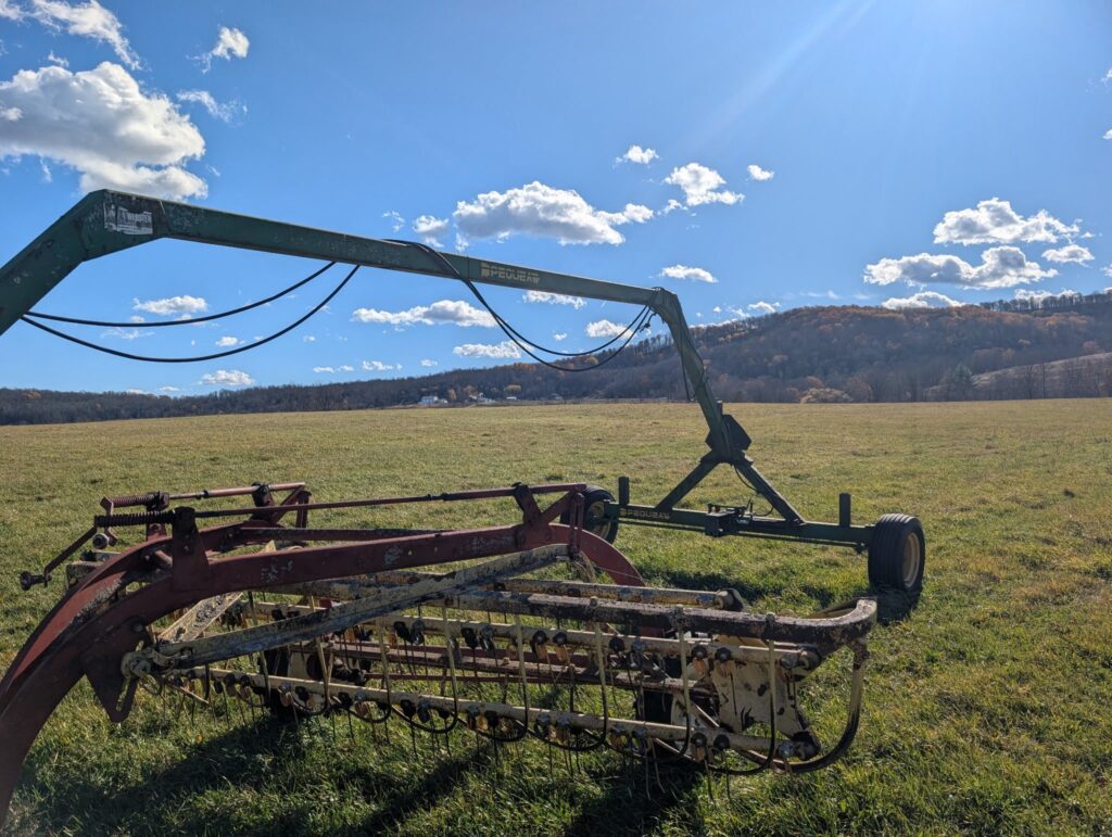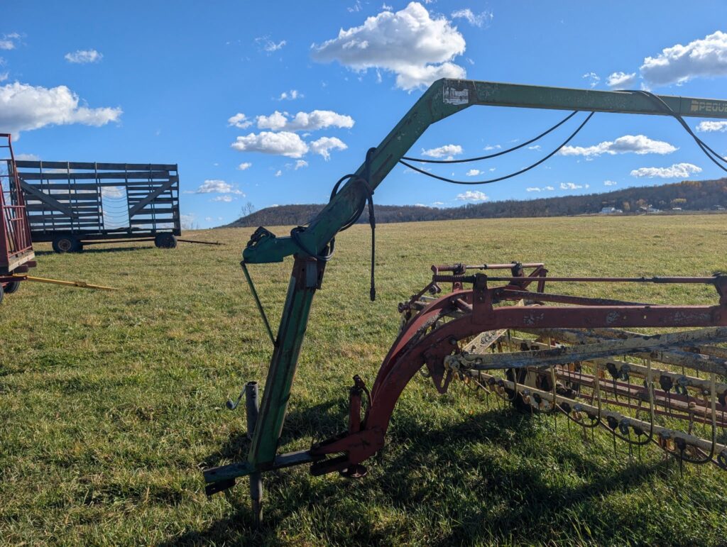 278 New Holland Hayliner Square Baler works run as should,  Kowalski Farm Maxx FDM -165–3pth Disc Mower-6ft cut , Like new used once.  Peque double hay rake hitch, Killsboro Gravity Wagon- good condition-on good running gear