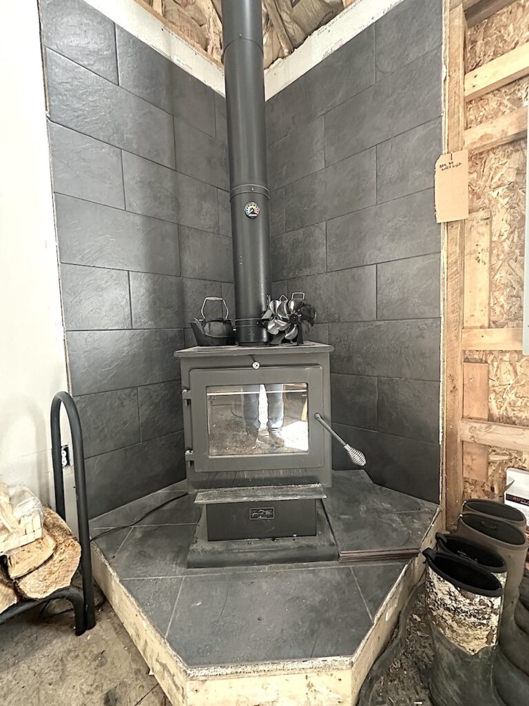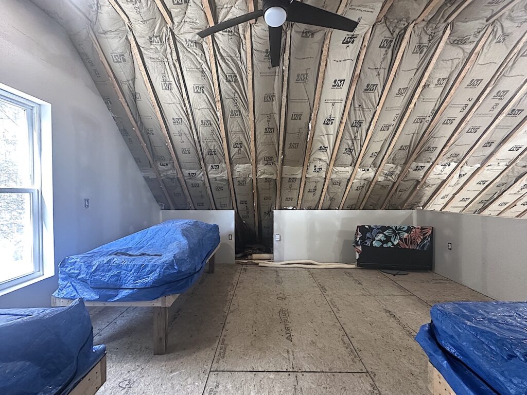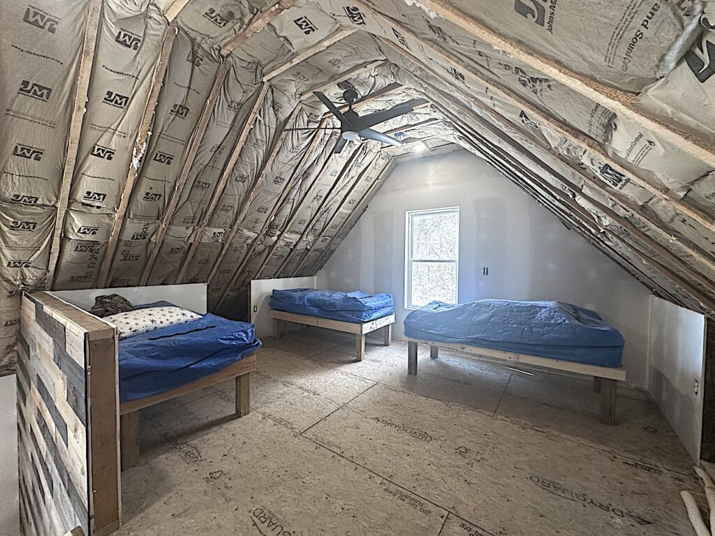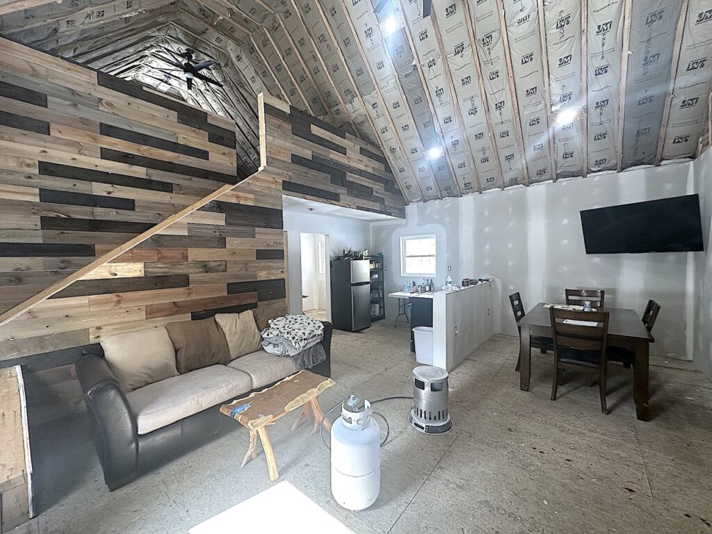 The main level features an open living area with a wood stove, along with a small kitchen area ready for completion, and a spacious first-floor bedroom. Upstairs, a large loft provides flexible space for additional sleeping. The cabin has insulation, drywall, and electricity already in place.