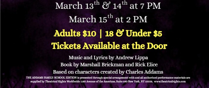 The Alfred-Almond Central School Performing Arts Department will proudly present “The Addams Family: School Edition” with performances at 7:00 pm Friday, March 13 and Saturday, March 14, along with a matinee performance on Sunday, March 15 at 2:00 pm in the school’s auditorium.