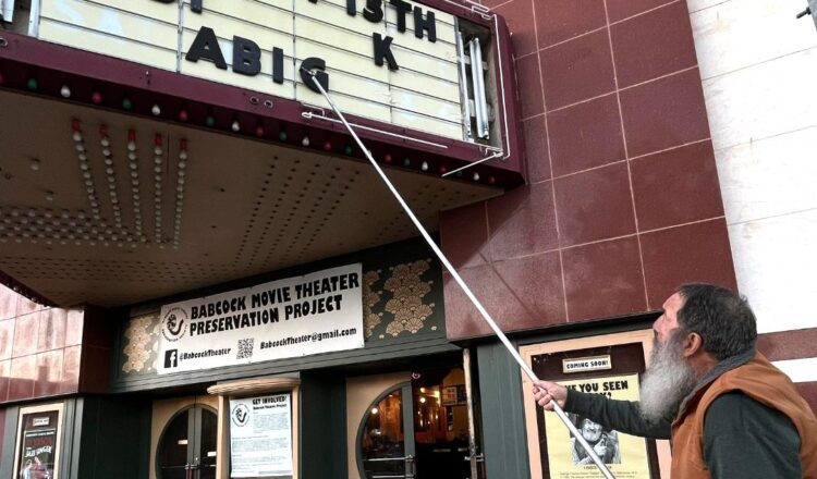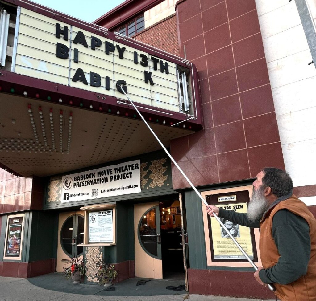 Babcock Theater Preservation Society Chair Barry Glickstein has mastered the task of hanging letters on the theater marquee